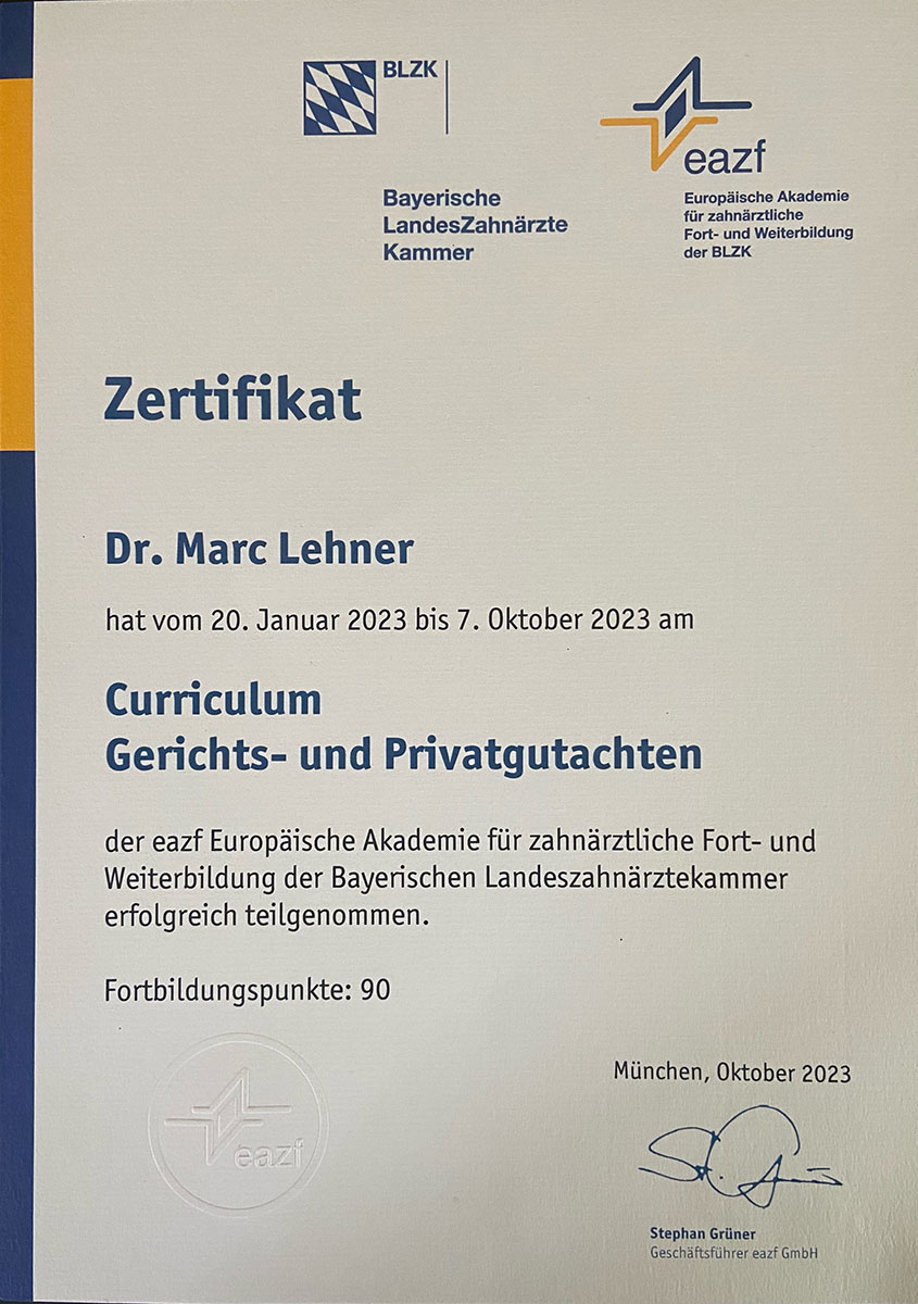 Erfreuliche Nachrichten aus unserem Team: Dr. Marc Lehner hat das Curriculum Gerichts- und Privatgutachten der Europäischen Akademie für zahnärztliche Fort- und Weiterbildung (eazf) kürzlich erfolgreich abgeschlossen! Wir gratulieren Dr. Lehner ganz herzlich dazu!